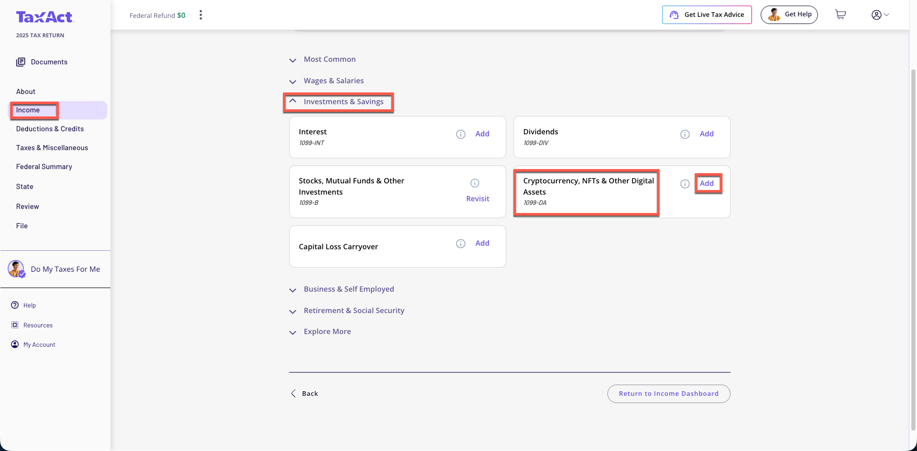 From within your TaxAct return, click Income.